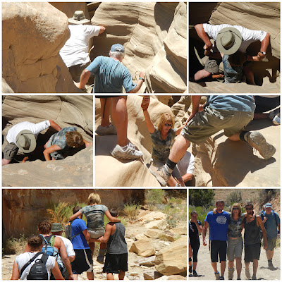 Thursday morning we left on a Montgomery Family camping trip down to Bryce Canyon. We had such a great time with everyone. On the first day we went into the park and drove to the scenic over looks and saw all of the beautiful red rock formations. The second day we went on a hike in the morning and the afternoon we spent getting dirty four wheeling. I don't think any of us have ever been that dirty... especially Grandma! Since there hasn't been any rain all of the trails were just inches of loose dirt. My pictures don't do justice. I rode on the four wheeler with Grandma on the back and I don't think she will do that again. At one point she asked me how fast we were going and I told her 35, she then responded that it felt like we were going 150. Poor Grandma I probably gave her a heart attack. The next day we headed down the long dirt roads to see an Arch and hike some slot canyons. We had hiked a mile to get to the slot canyon and had just started dropping into it. The younger ones did it with ease then it was Joni's turn. When she was trying to get down she slipped and fell and all we heard from up above was "$%&* it's broke." I as did my parents thought she was meaning her camera but we quickly found out it was her ankle. A little bit of panic set in as we wondered how we would get her out. Thank goodness we were all together. Megan used her skills and made her a splint with a shirt and sticks and then the boys and men hoisted her out with a rope that my dad had thankfully packed. Once we got her out there was still a mile hike back to the cars. She was treated like royalty as the boys picked her up and carried or supported her the whole way back. We made it back to camp and all of us kid's went swimming in the pool that was at the camp while the parents hung out with Joni with her foot in a cooler. We left the campground around 7 to head home. It was a very long drive especially because I was the driver since my mom and dad were passed out along with the kids'. But we did make it home safely and the verdict on Joni's foot is that the ligaments are strained and she is in a boot for 3 weeks.